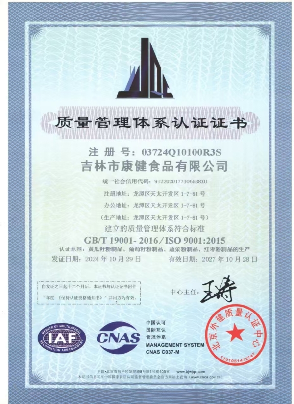 我公司是全国首家生产黄瓜籽粉的专业厂家,自从2000年开始,产品正式投放市场并受到一致好评,本企业已通过ISO9001:2008质量管理体系认证,已取得全国工业产品生产许可证。